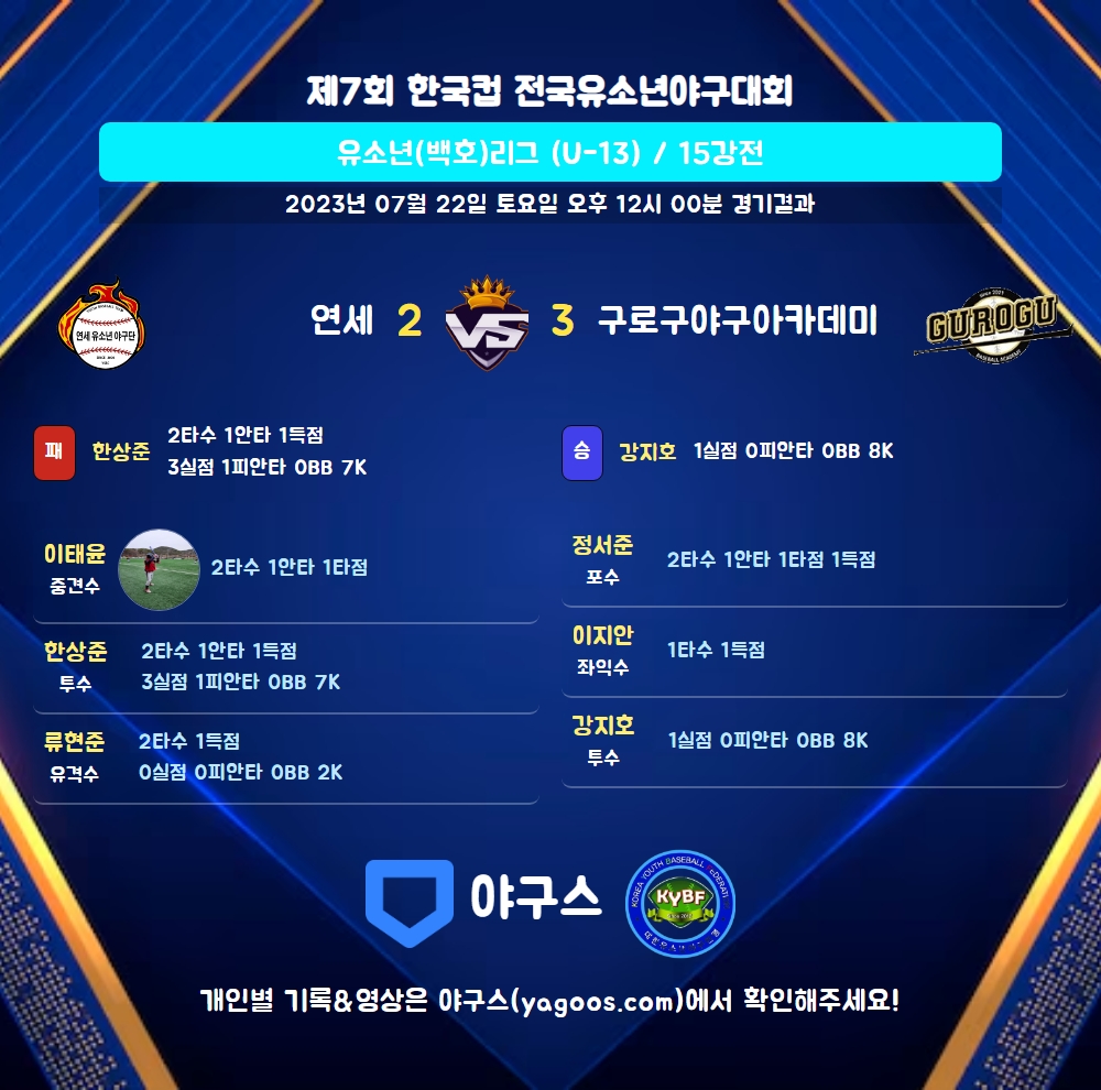 | 구로구야구아카데미 | 0 | 0 | 3 | 0 | - | 3 | 1 | 1 | 6 |