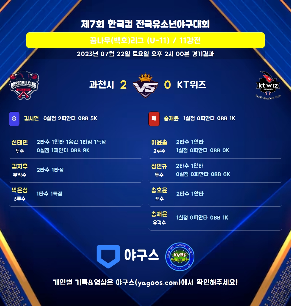 | 2 | 김시언(100) | 승 | - | 7 | 2 | 2 | 0 | - | 5 | 34 | 0 | 0 | 0 |