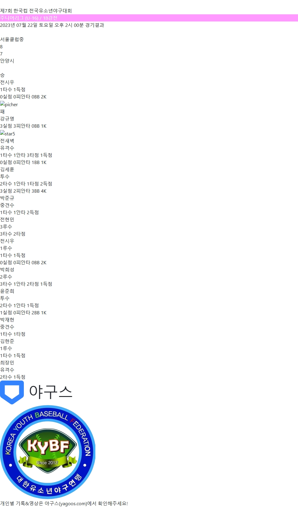 | 7 | 투 | 강서진(9) | - | - | - | 삼진 | 1 | 0 | 0 | 0 | 0 | 0 | - | 1 | 0.000 |