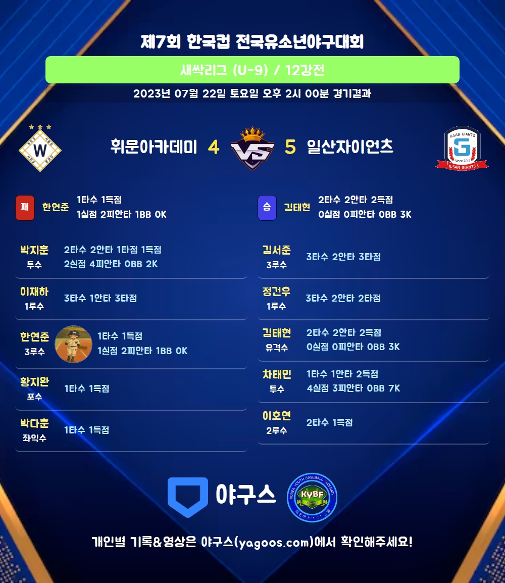 | 일산자이언츠 | 2 | 0 | 0 | 3 | 5 | 7 | 2 | 6 |
