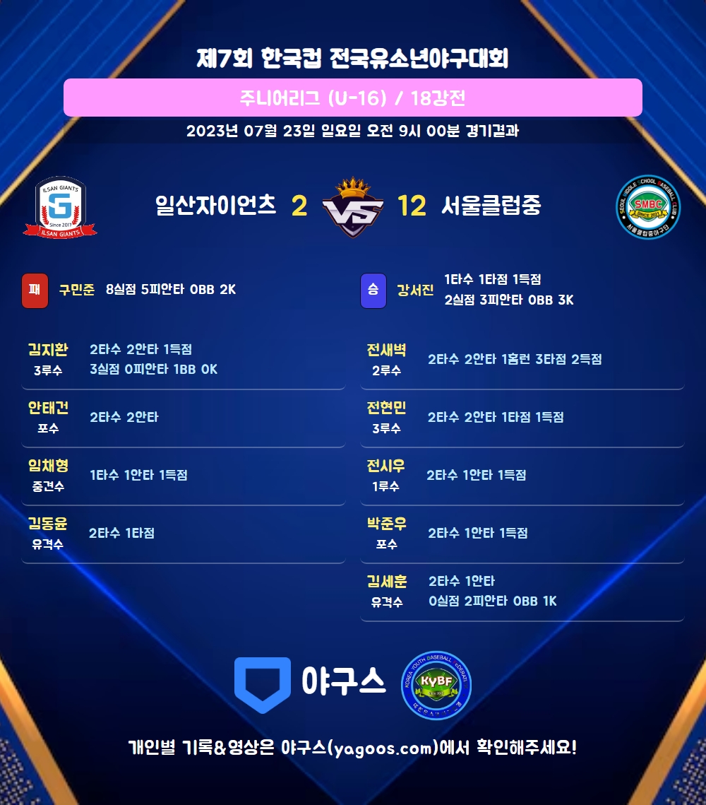 | 서울클럽중 | 3 | 2 | 7 | 12 | 7 | 0 | 7 |