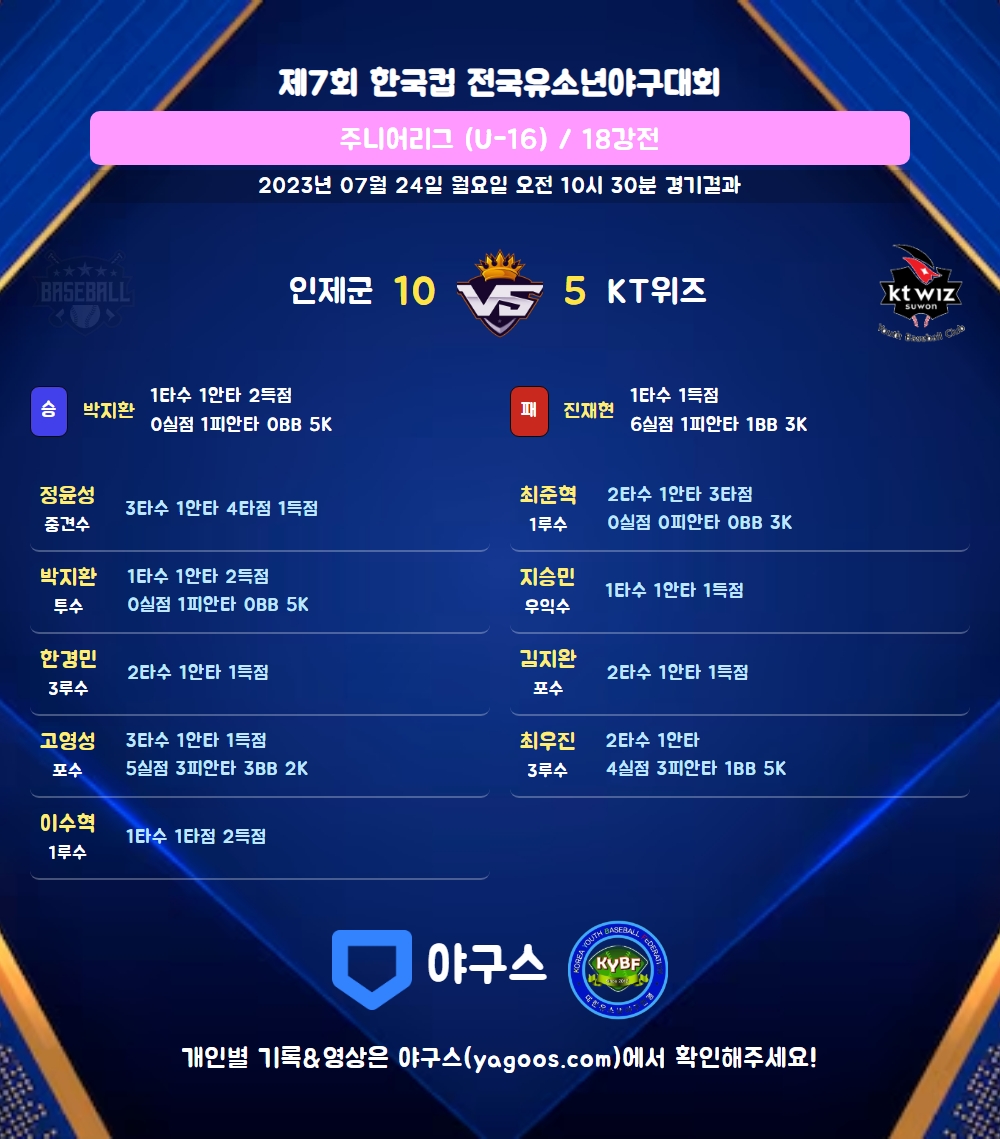 | 1 | 박지환(36) | 승 | - | 10 | 1 | 1 | 0 | - | 5 | 37 | 0 | 0 | 0 |