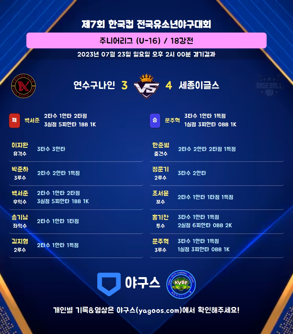 | 세종이글스 | 1 | 0 | 2 | 1 | 0 | 4 | 7 | 0 | 3 |
