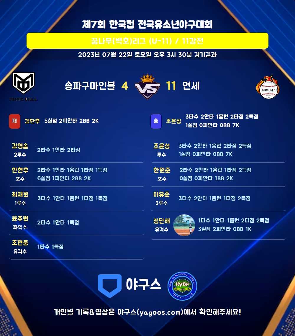 | 홈런 | 안현우(2) 최재원(59) 이유준(37) 정단해(18) 조윤성(26) 한원준(12) |