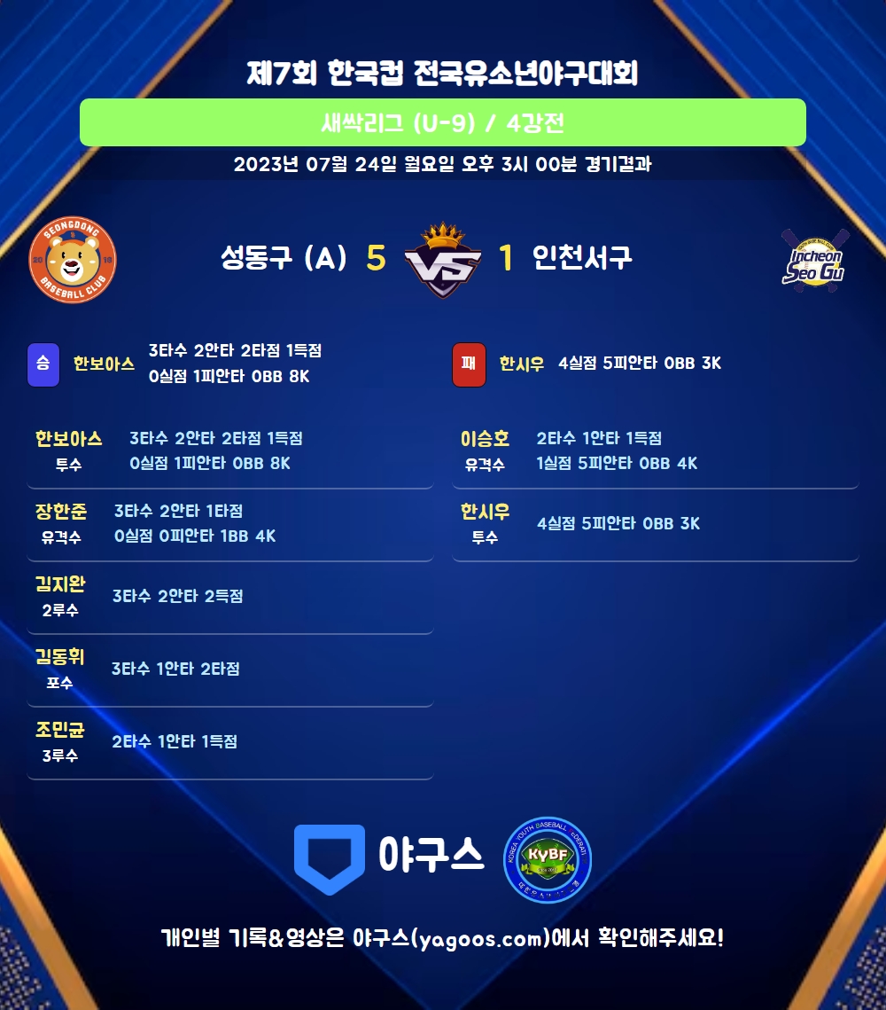 | 5 | 三 | 조민균(17) | - | 4구 | 포내안 | 투땅 | - | 2 | 1 | 0 | 1 | 0 | 0 | 1 | 0 | 0.500 |