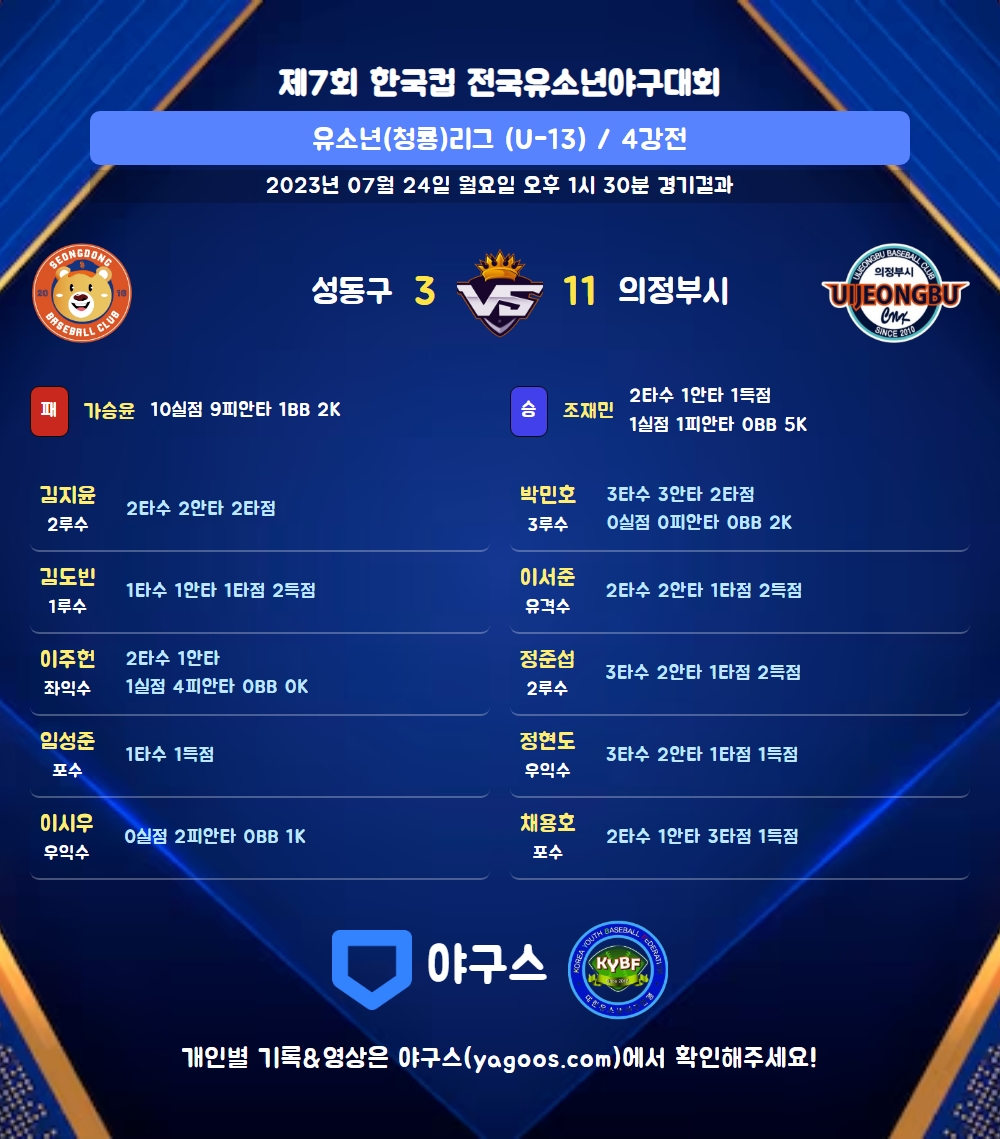 | 6 | 포 | 채용호(19) | 우중안 | 3땅 | - | - | 2 | 1 | 3 | 1 | 0 | 0 | - | 0 | 0.500 |