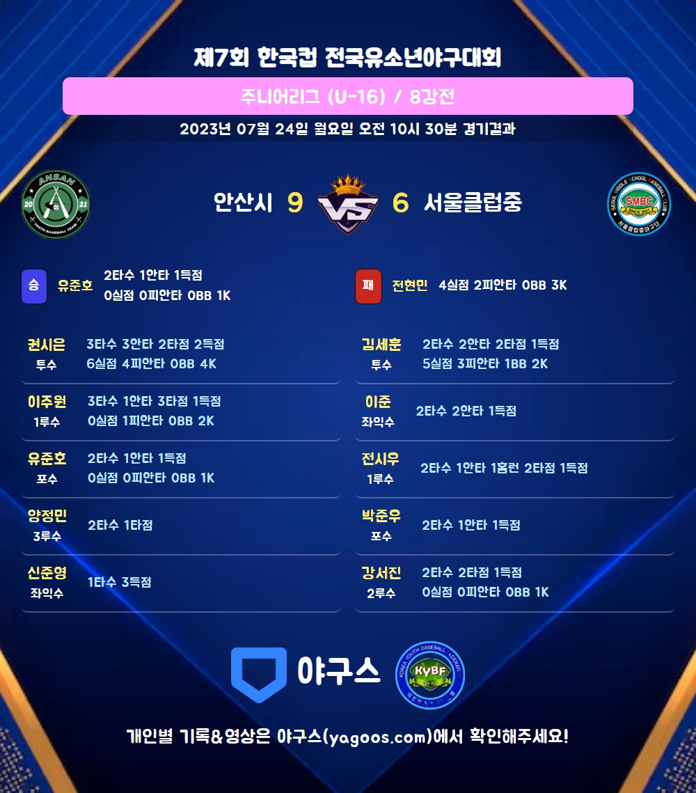 | 서울클럽중 | 0 | 6 | 0 | 0 | 6 | 6 | 2 | 3 |