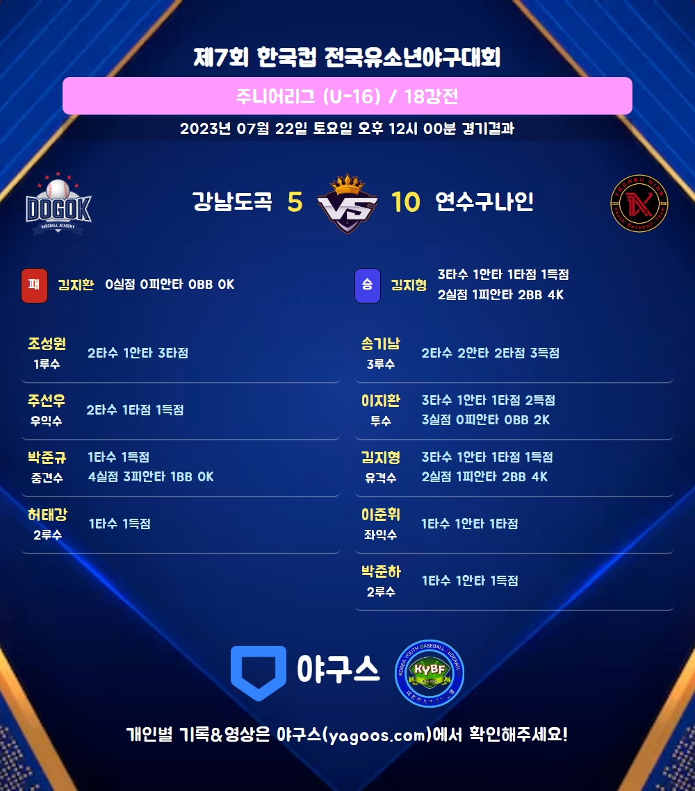 | 2 | 김지형(17) | 승 | - | 9 | 1 | 1 | 0 | 2 | 4 | 33 | 2 | 2 | 0 |