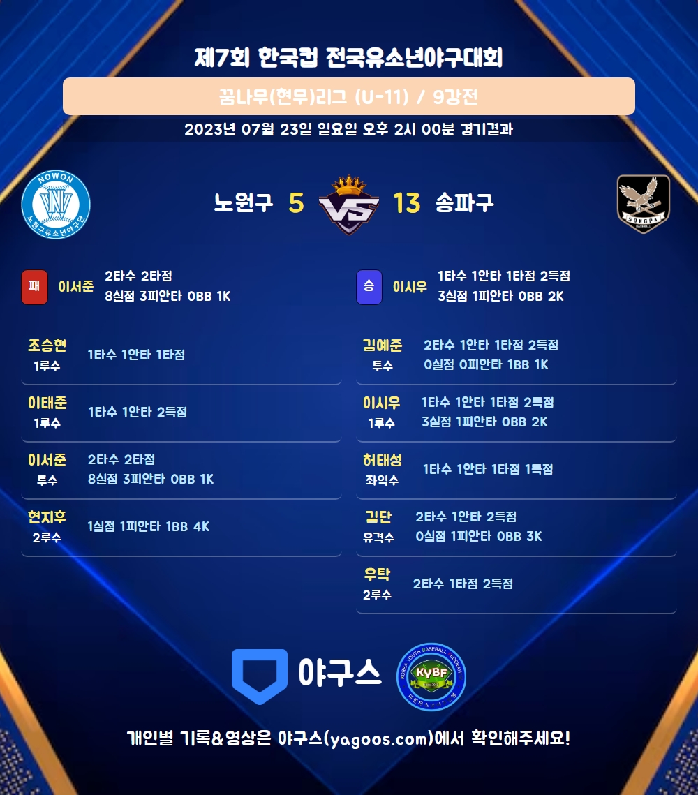 | 1 | 이서준(7) | 패 | - | 9 | 3 | 3 | 0 | 4 | 1 | 43 | 8 | 8 | 0 |