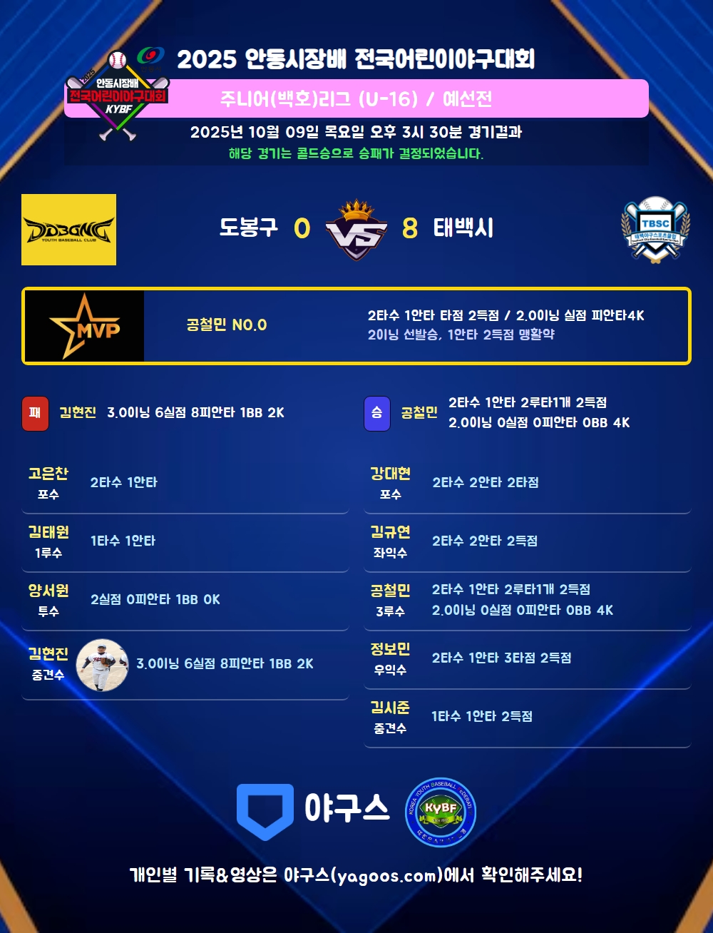 | 5 | 우 | 정보민(8) | - | 사구 | 우안(2타점) | 2땅출(1타점) | 2 | 1 | 3 | 2 | - | - | 1 | - | 0.500 |