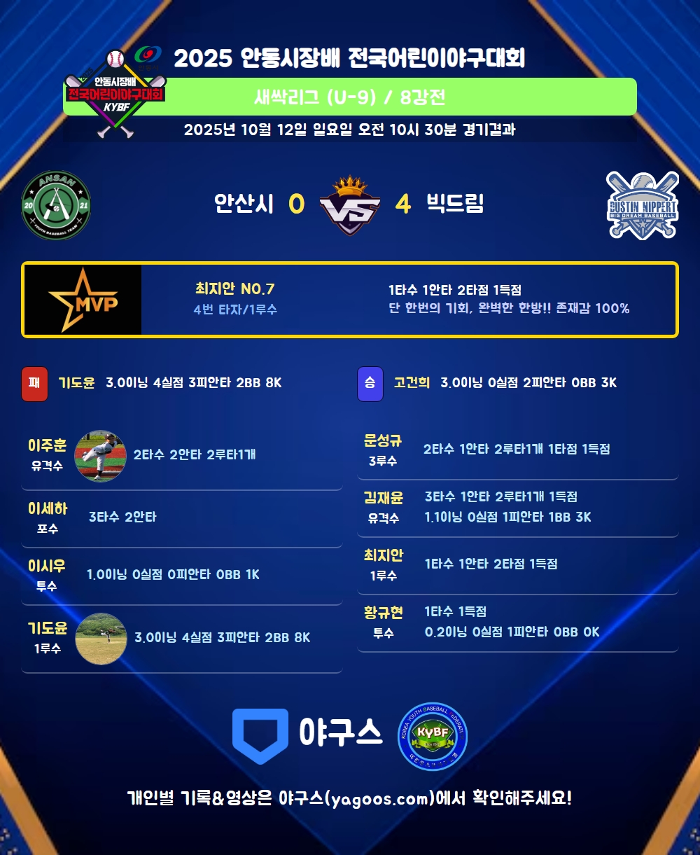 | 4 | 一 | 최지안 (7) | - | 사구 | 3내안(2타점) | - | - | 1 | 1 | 2 | 1 | - | - | 1 | - | 1.000 |