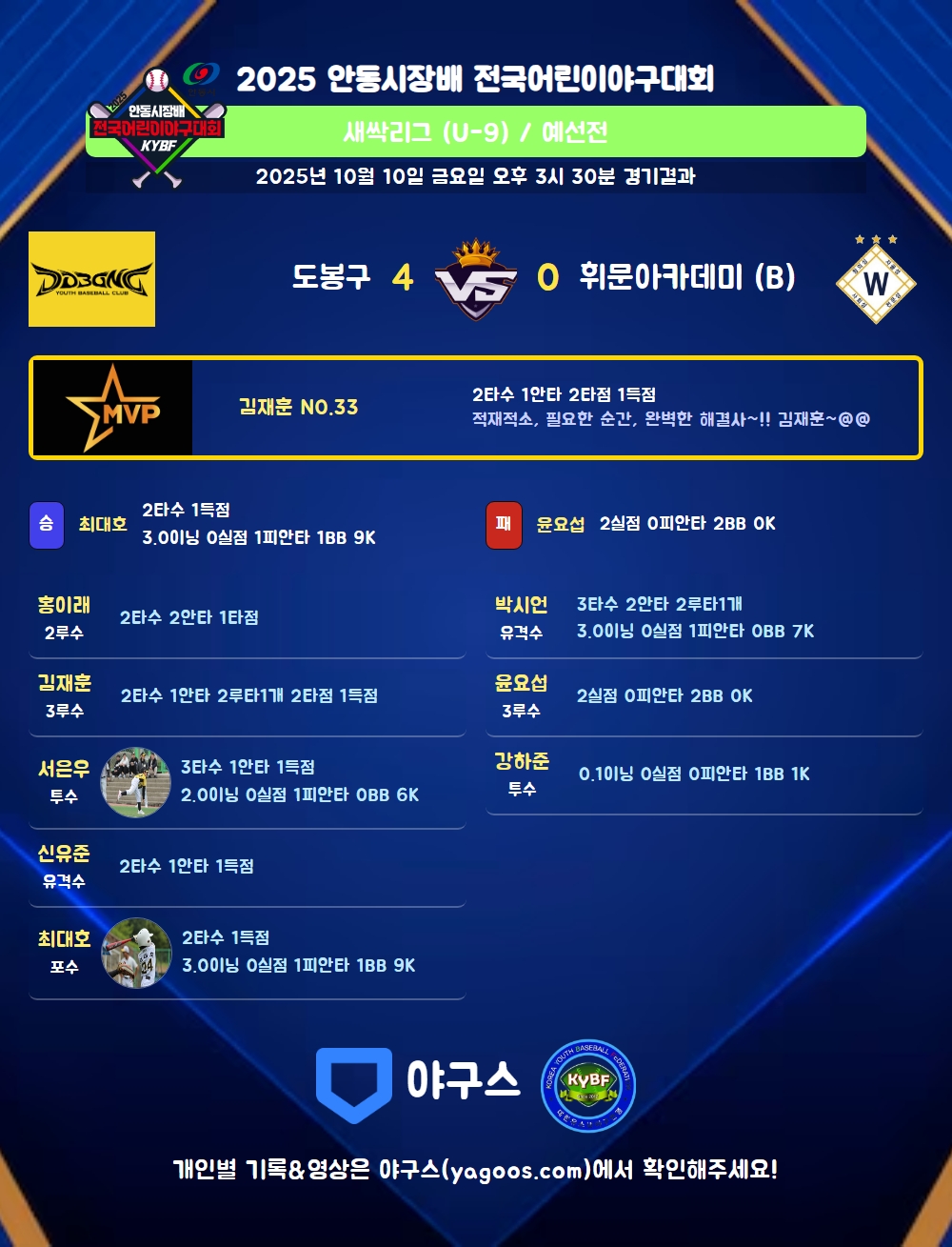 | 2루타 | 김재훈(33) 박시언(6) |