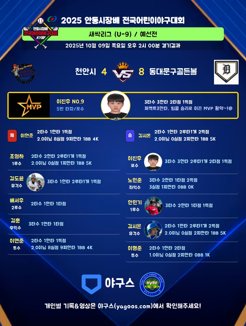 | 2루타 | 김도윤(2) 조영하(1) 김시온(6) 이진우(9) |