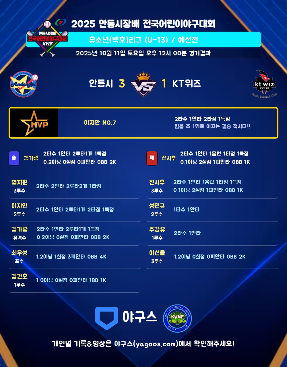 | 7 | 중 | 김유준(25) | - | 삼진 | 사구 | - | - | 1 | 0 | - | - | - | - | 1 | 1 | 0.000 |