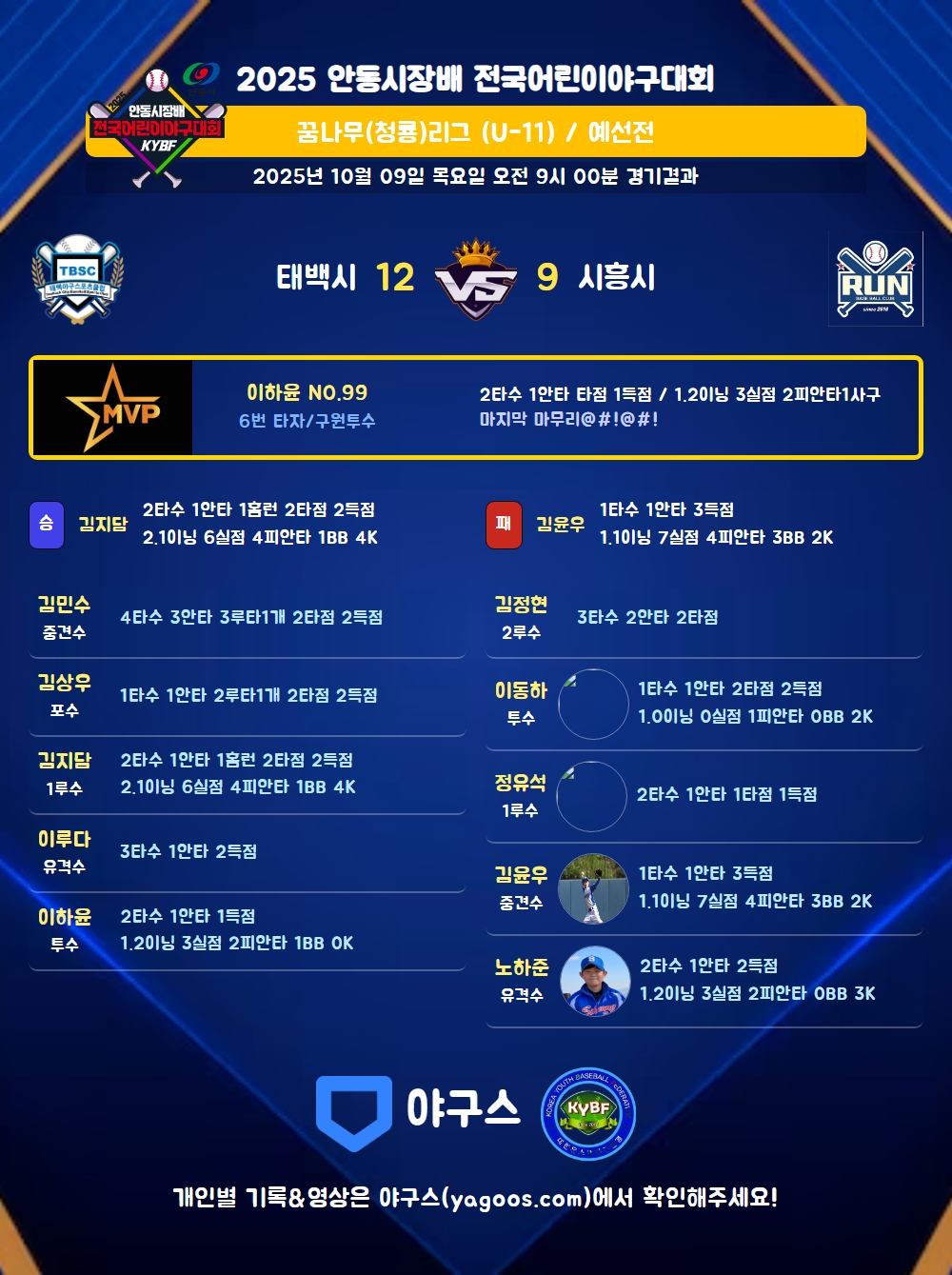 | 2 | 중 | 김민수(2) | 좌중3 | 유땅(1타점) | 좌안(1타점) | 좌안 | - | 4 | 3 | 2 | 2 | - | - | - | - | 0.750 |