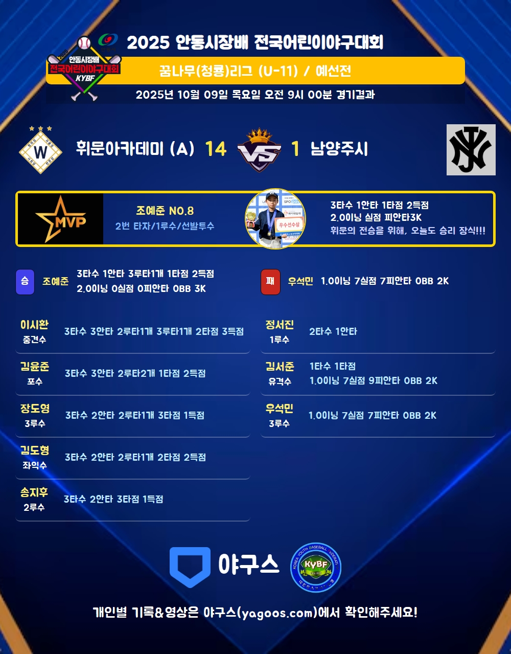 | 1 | 조예준(8) | 승 | 2.0 | 6 | 5 | - | - | 1 | 3 | 29 | - | - | 0 |