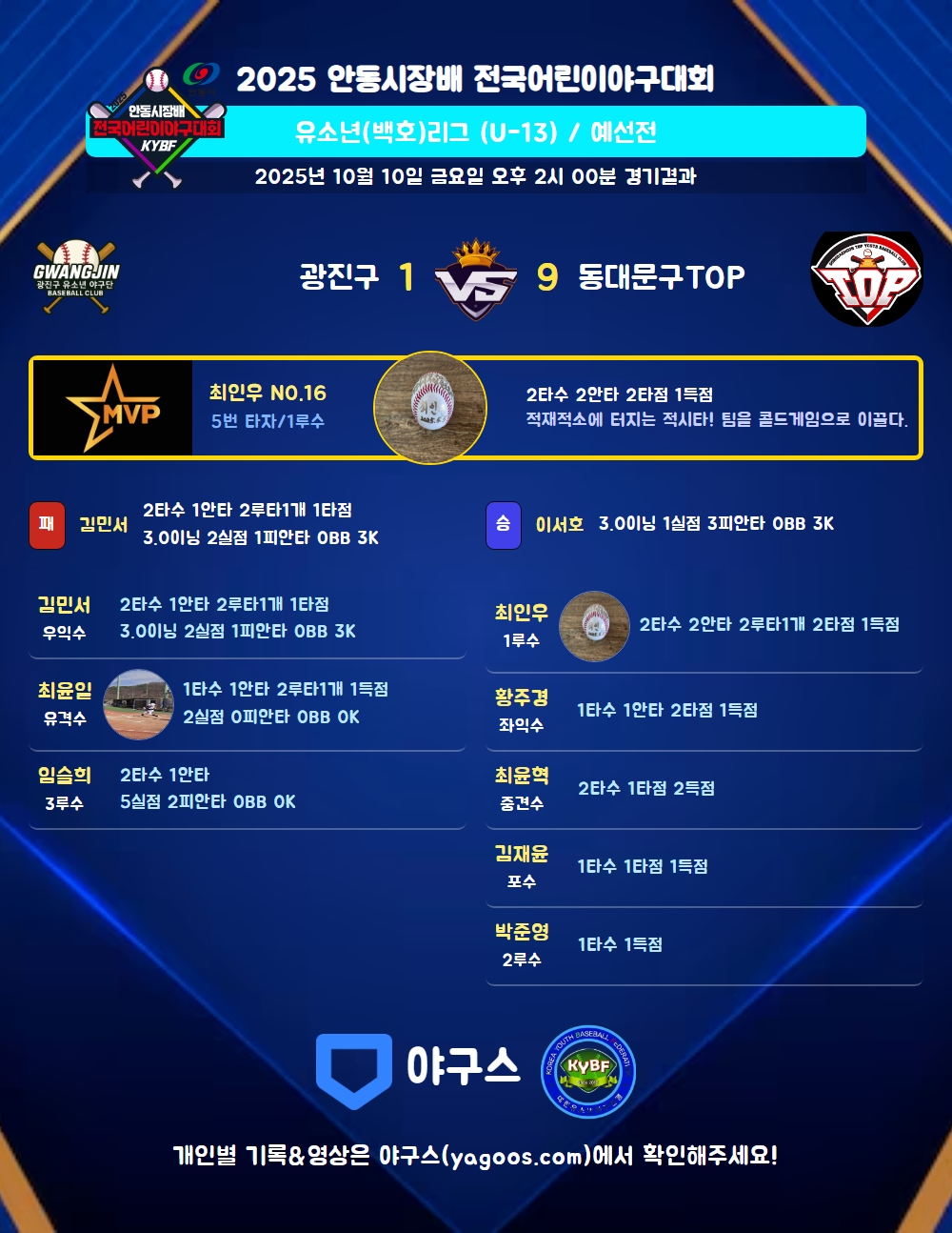 | 5 | 一 | 이승우(9) | - | 투땅 | - | 3실 | 2 | 0 | - | - | - | - | - | - | 0.000 |