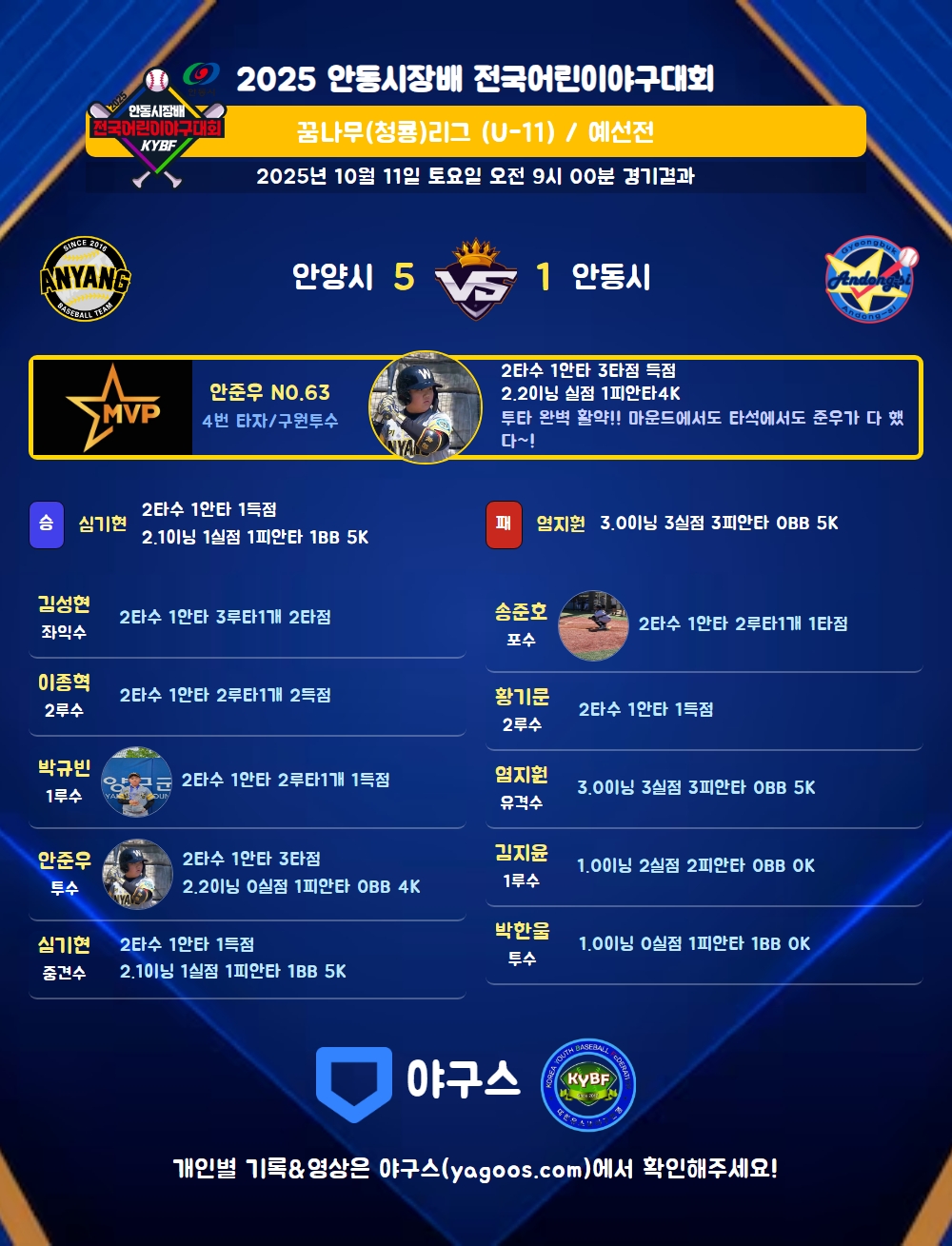 | 4 | 투 | 안준우(63) | 4구 | - | 좌중안(2타점) | - | 유직 | - | 2 | 1 | 3 | - | - | - | 1 | - | 0.500 |
