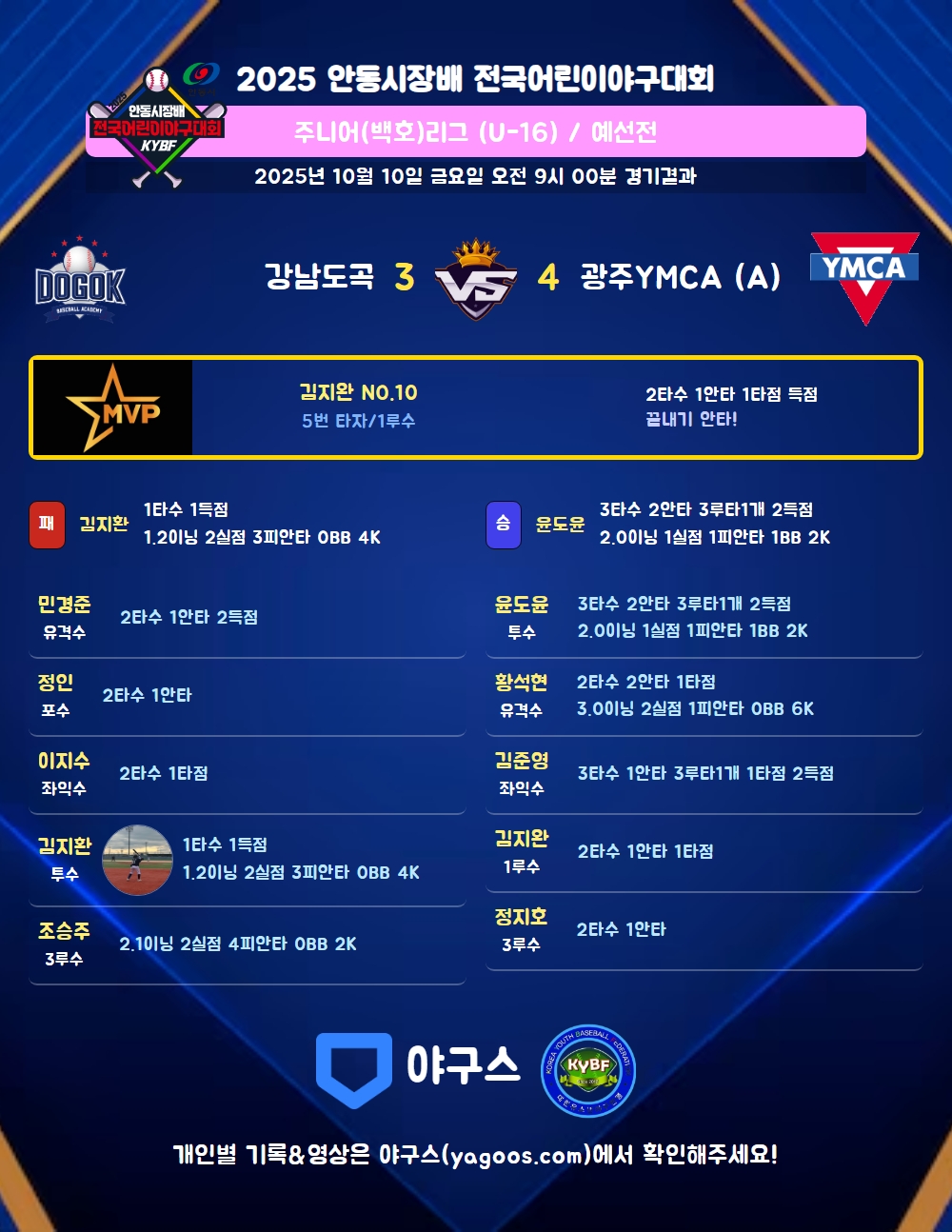 | 5 | 一 | 김지완(10) | 우플 | - | 4구 | - | 중안(1타점) | 2 | 1 | 1 | - | - | 1 | 1 | - | 0.500 |