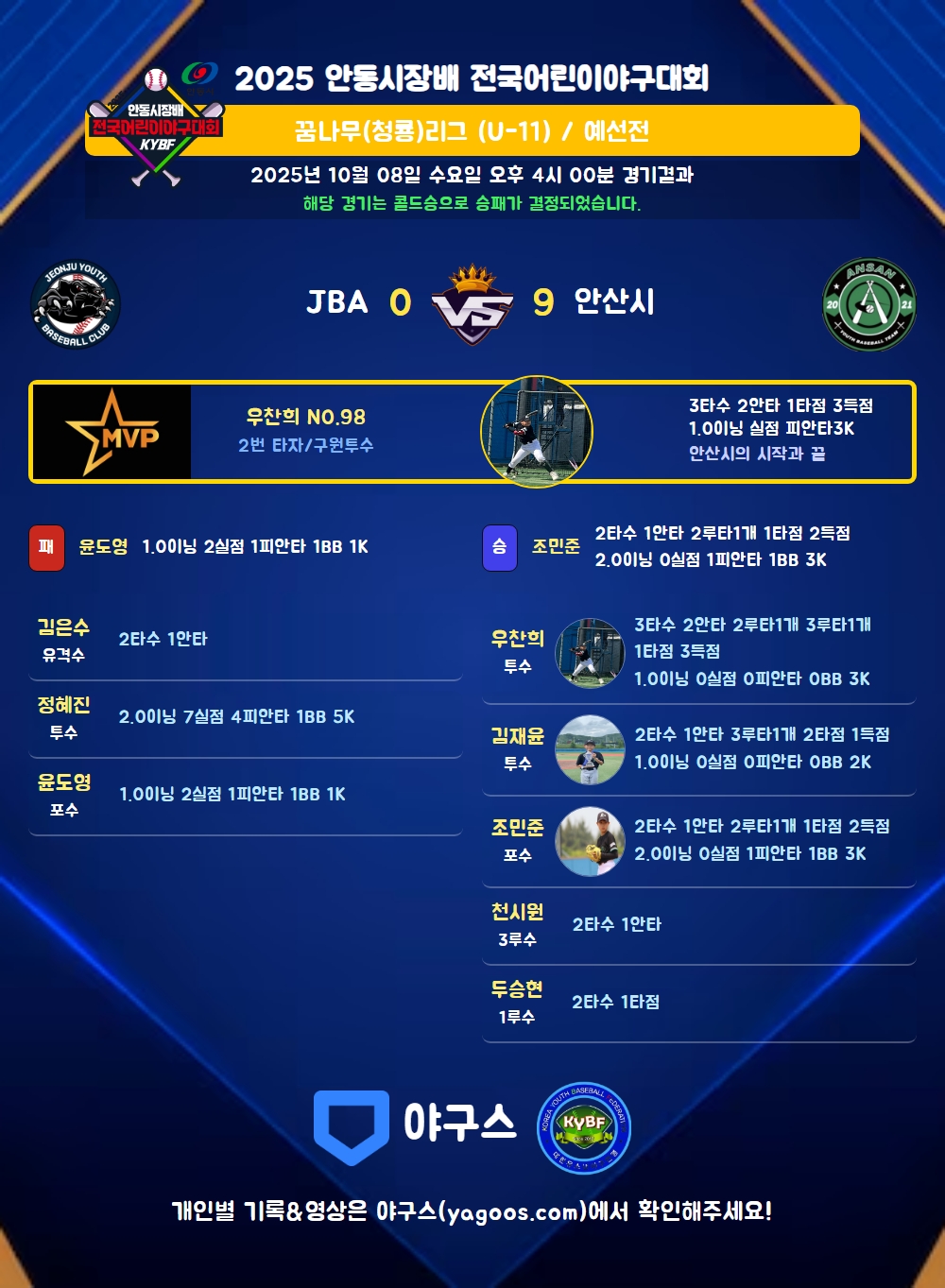 | 2루타 | 우찬희(98) 조민준(21) |