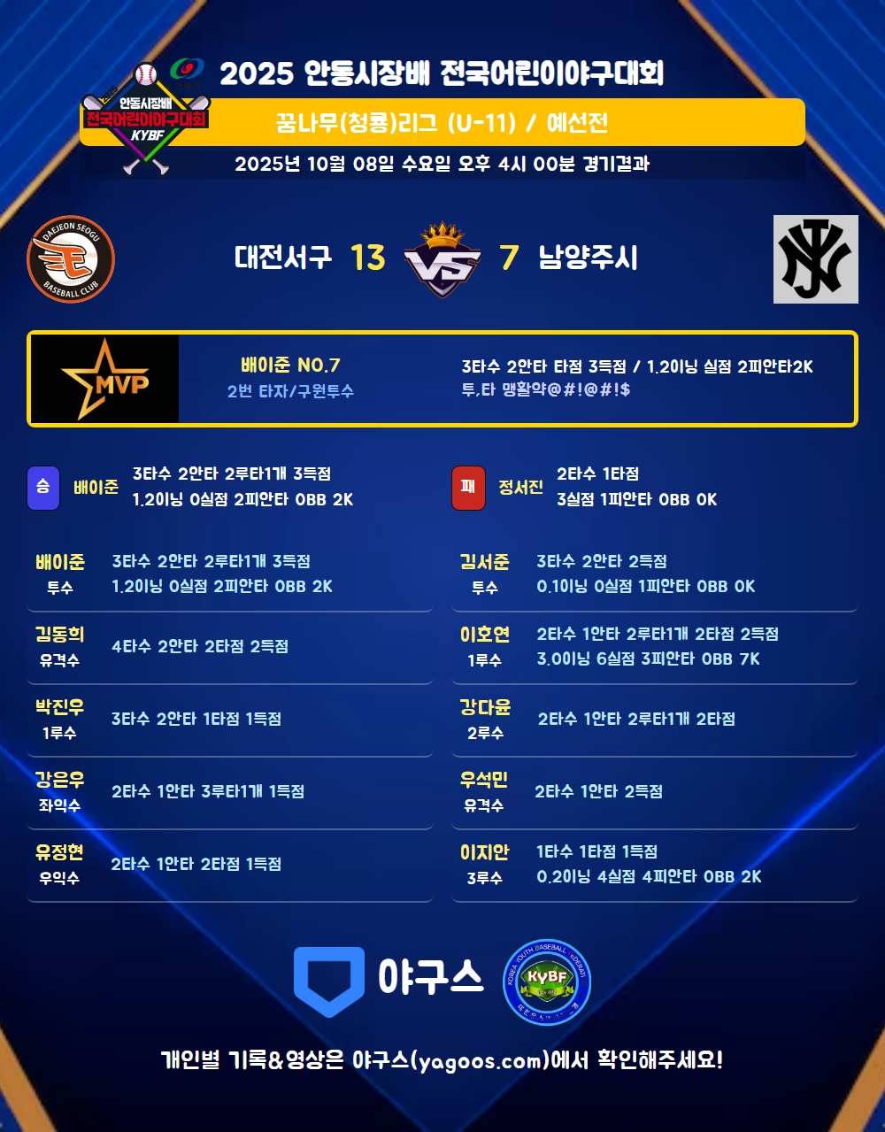 | 2 | 투 | 배이준(7) | - | 좌중2 | - | 4구/유내안 | - | 3 | 2 | - | 3 | - | 5 | 1 | 1 | 0.667 |