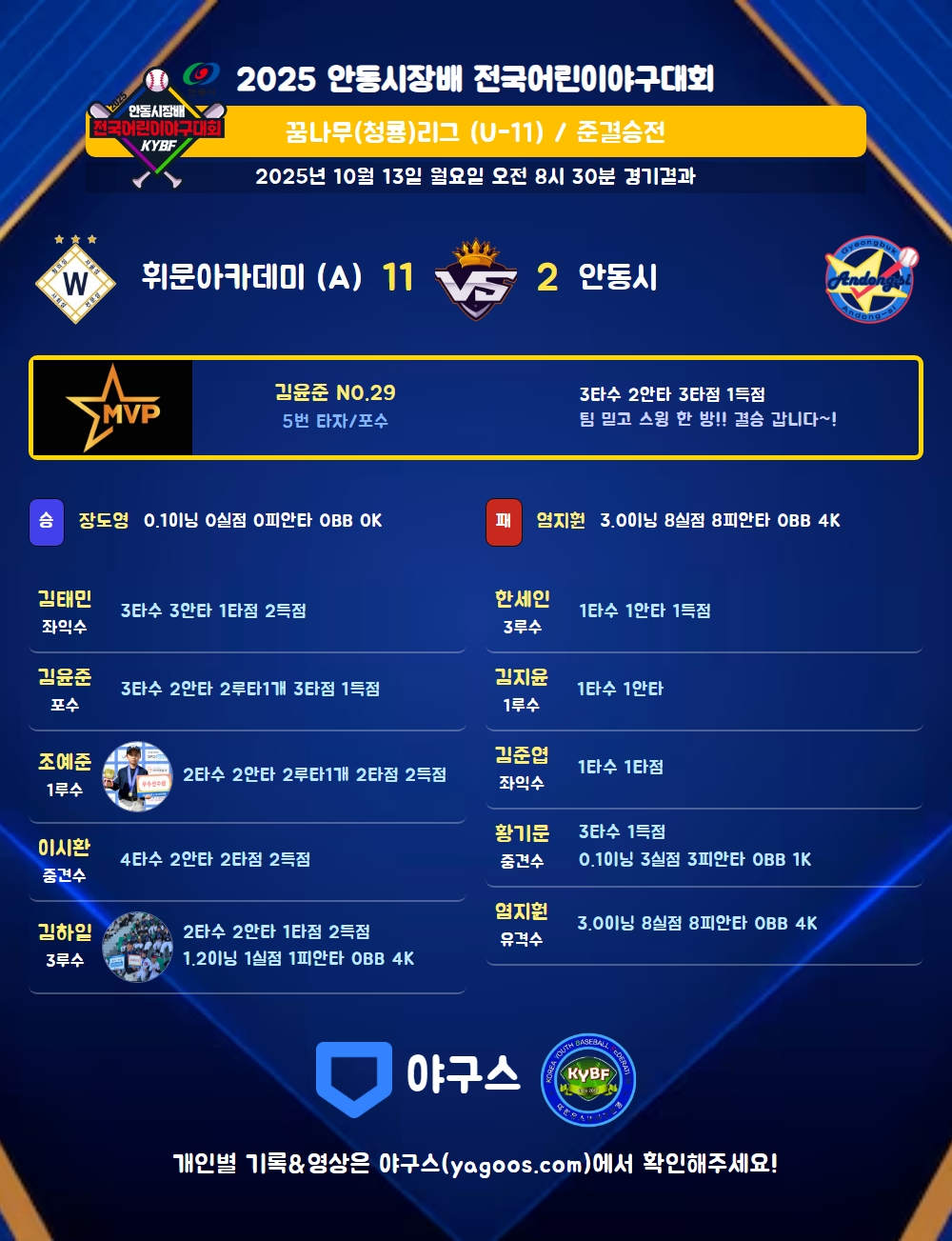 | 2루타 | 조예준(8) 김윤준(29) |