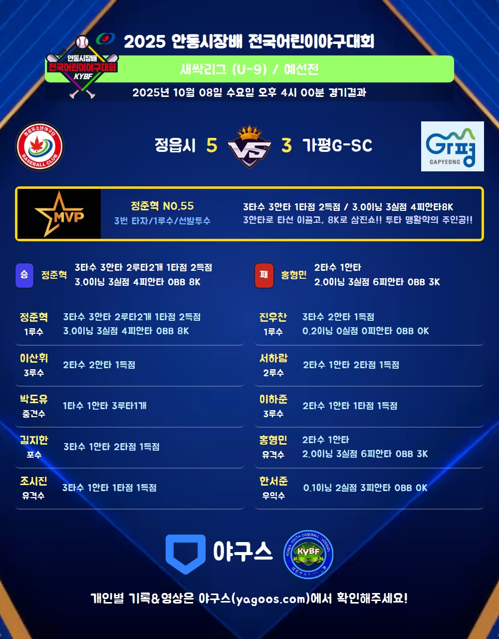 | 3 | 一 | 정준혁(55) | 좌중2(1타점) | - | 좌선2 | 유내안 | - | - | 3 | 3 | 1 | 2 | - | - | - | - | 1.000 |