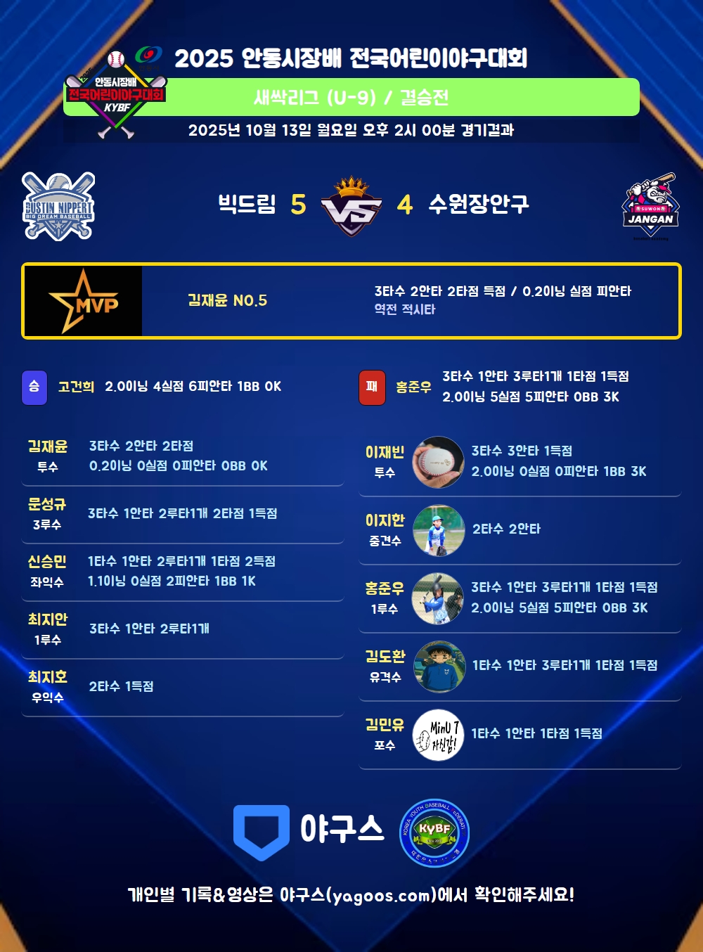 | 1 | 고건희(45) | 승 | 2.0 | 12 | 11 | 6 | - | 1 | - | 36 | 4 | 2 | 9.00 |