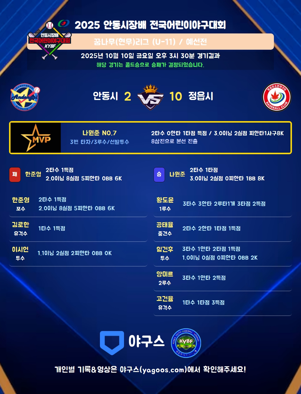 | 2 | 투 | 이시언(11) | 삼진 | 유땅 | - | 삼진 | 3 | 0 | - | - | - | - | - | 2 | 0.000 |