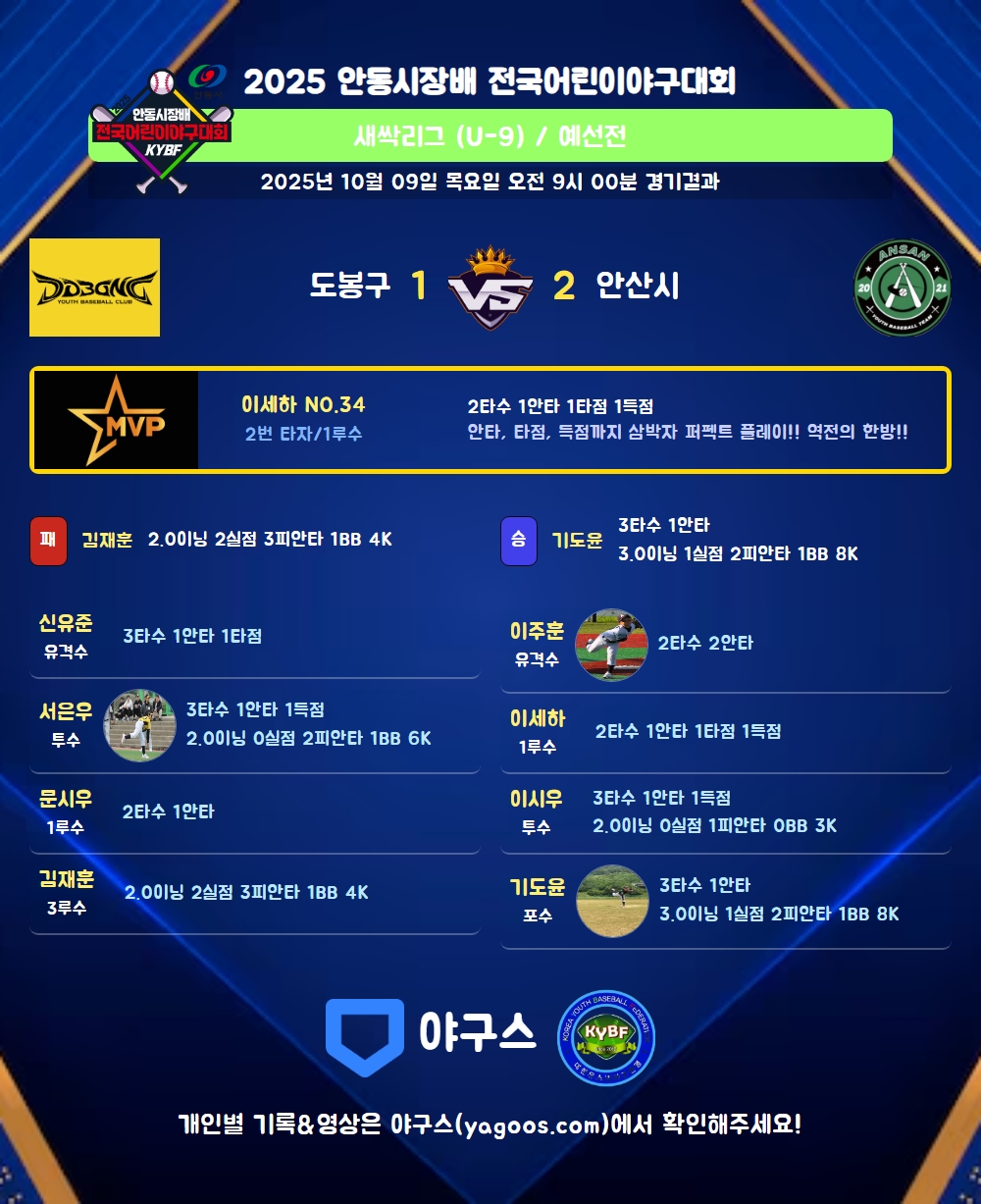 | 1 | 투 | 이시우(14) | 삼진 | - | 유내안 | 삼진 | - | 3 | 1 | - | 1 | - | - | - | 2 | 0.333 |