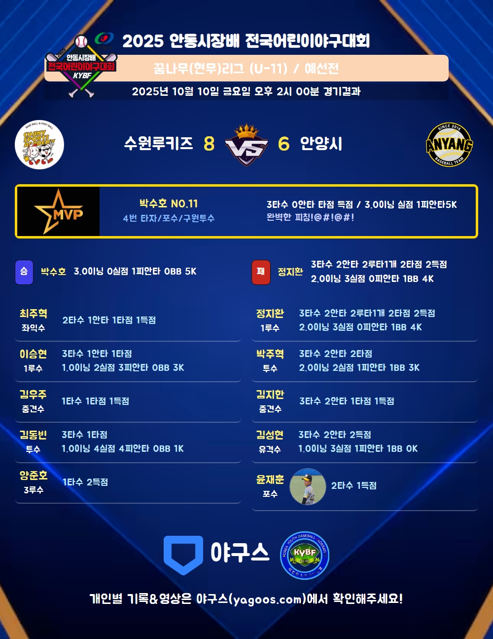 | 수원루키즈 | 0 | 1 | 3 | 4 | 0 | 0 | 8 | 2 | 0 | 6 | 0 |