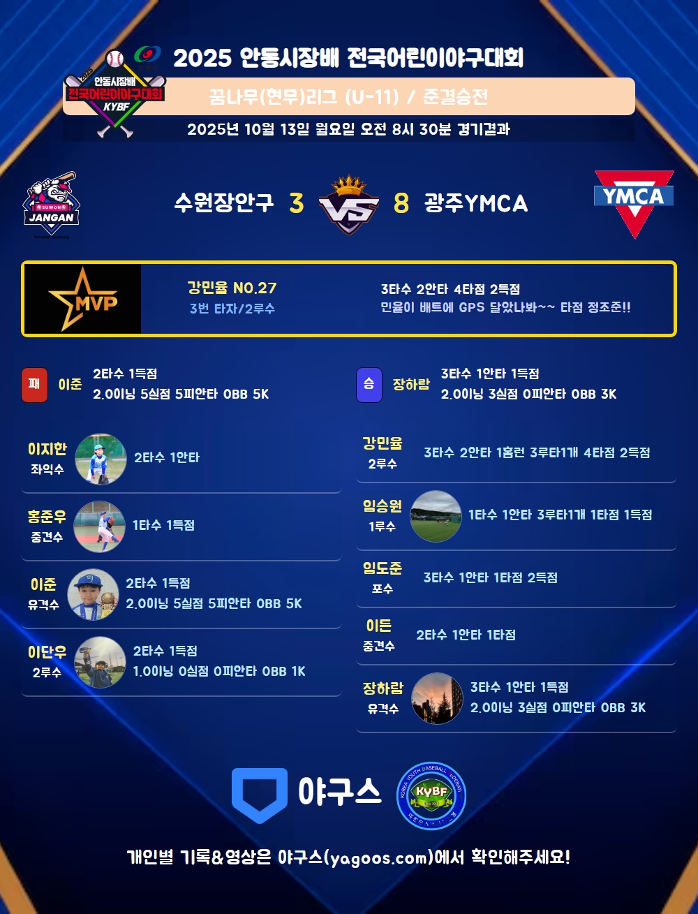 | 3 | 二 | 강민율(27) | 좌중G홈(2타점) | 삼진 | - | 좌선3(2타점) | - | 3 | 2 | 4 | 2 | 1 | - | - | 1 | 0.667 |