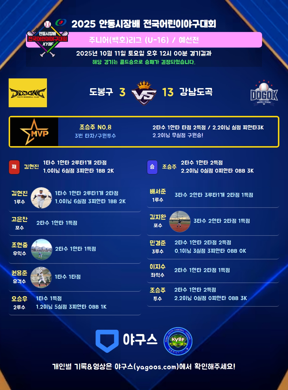 | 3 | 투 | 조승주(8) | 우안 | 유직 | 4구 | 2 | 1 | - | 2 | - | 1 | 1 | - | 0.500 |