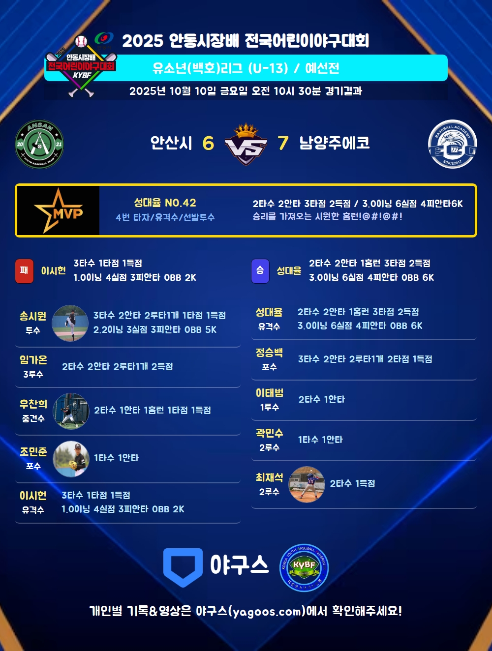 | 4 | 유 | 성대율(42) | 좌중홈(2타점) | 중안(1타점) | - | 4구 | 2 | 2 | 3 | 2 | 1 | - | 1 | - | 1.000 |
