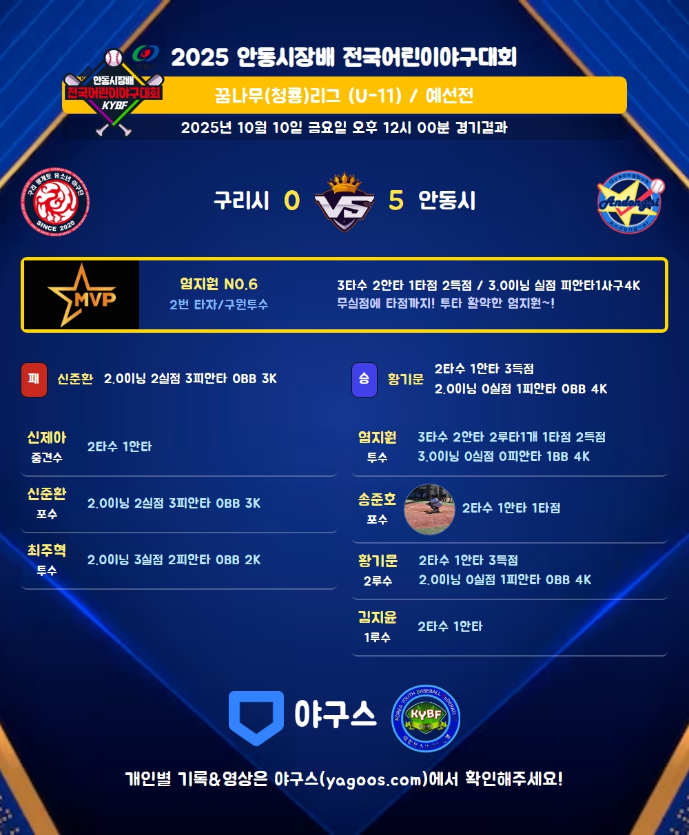 | 8 | 一 | 김민준(5) | - | - | 삼진 | - | 4구 | 1 | 0 | - | - | - | - | 1 | 1 | 0.000 |