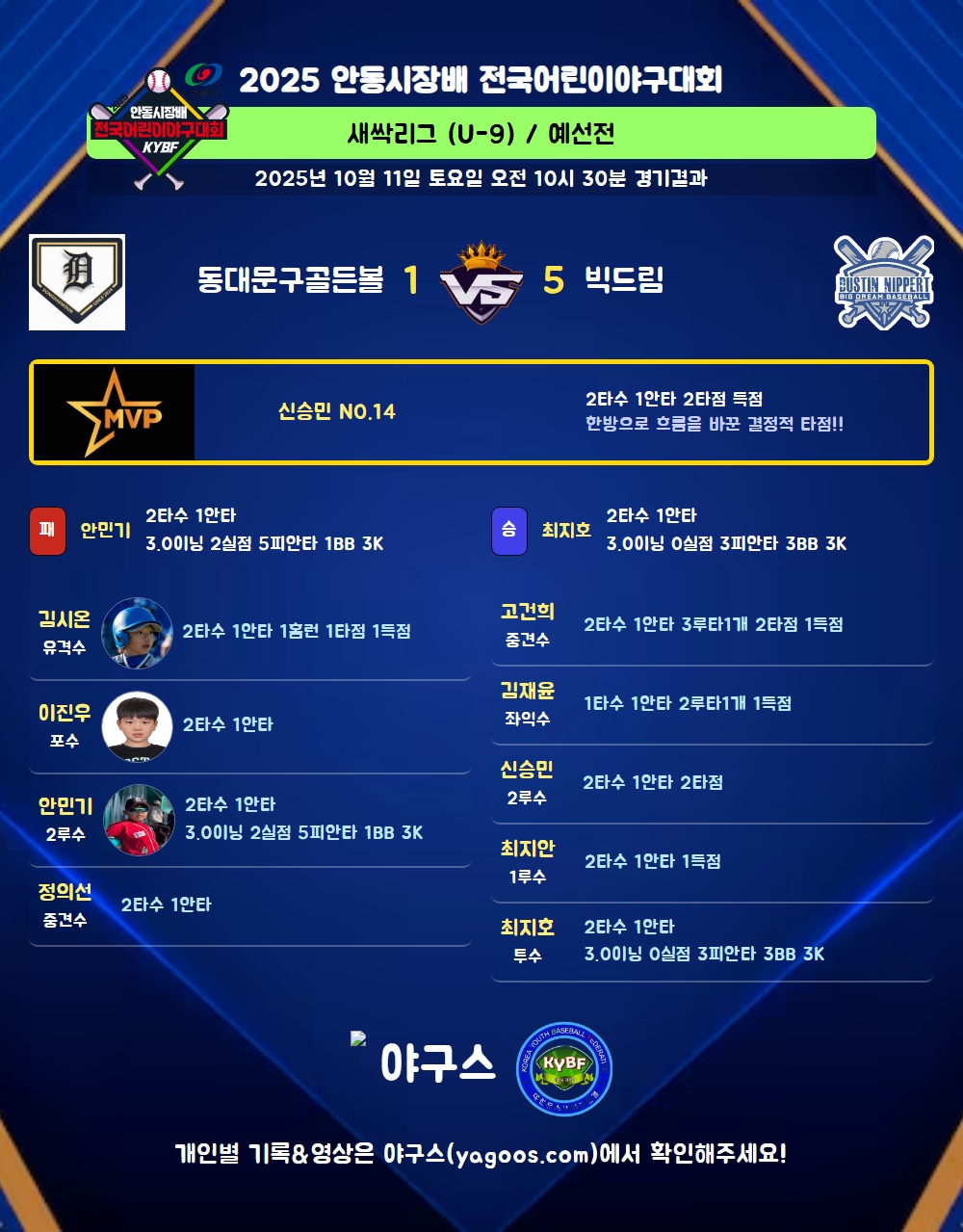 | 6 | 二 | 신승민(14) | 좌중안(2타점) | - | - | 1플 | - | 2 | 1 | 2 | - | - | - | - | - | 0.500 |