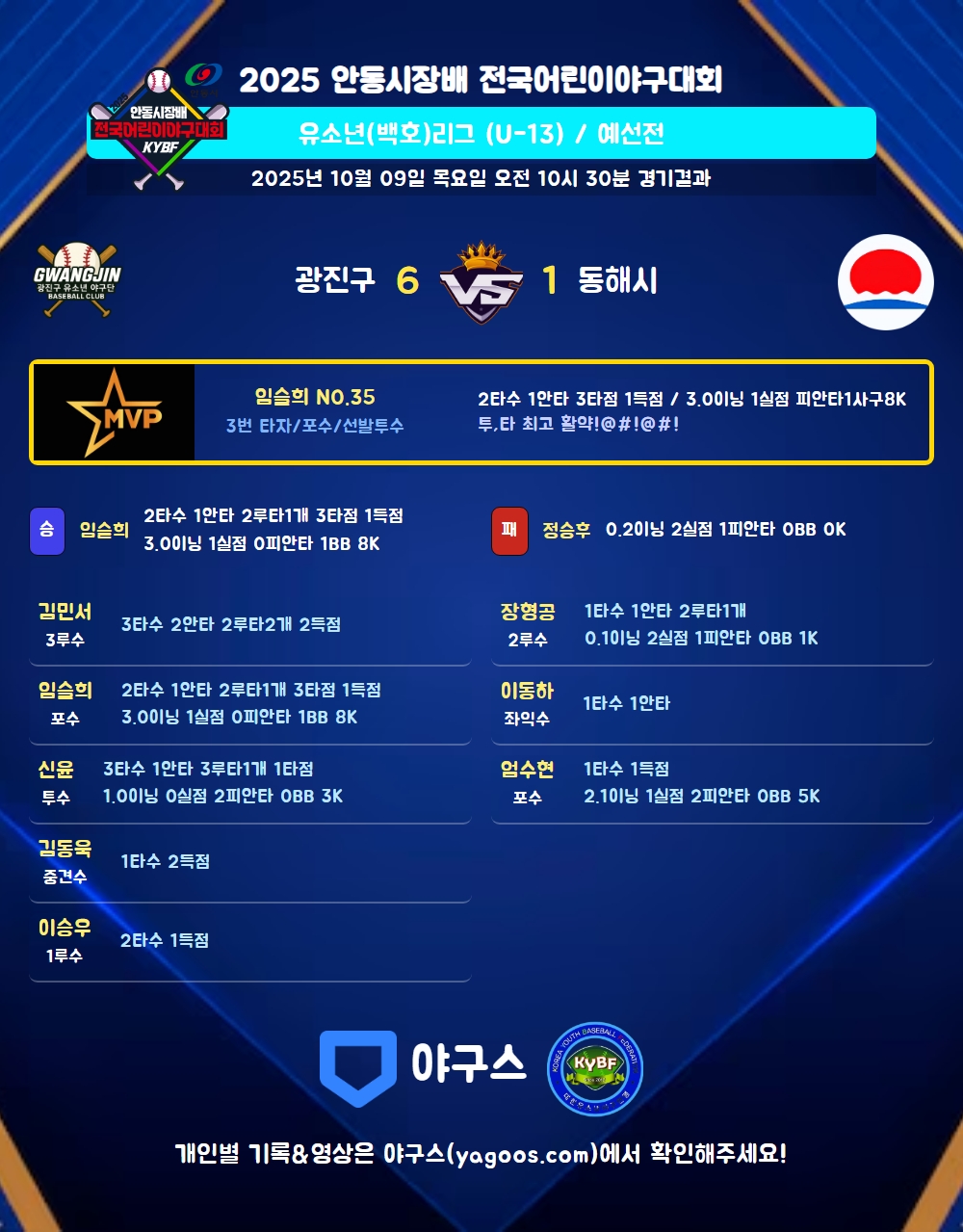 | 2루타 | 김민서(16) 임슬희(35) 장형공(12) |
