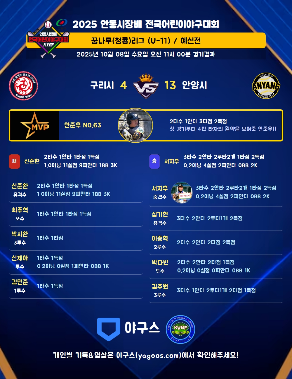 | 4 | 一 | 안준우(63) | 유야선(1타점)/사구 | 우중안(2타점) | - | 2 | 1 | 3 | 2 | - | - | 1 | - | 0.500 |