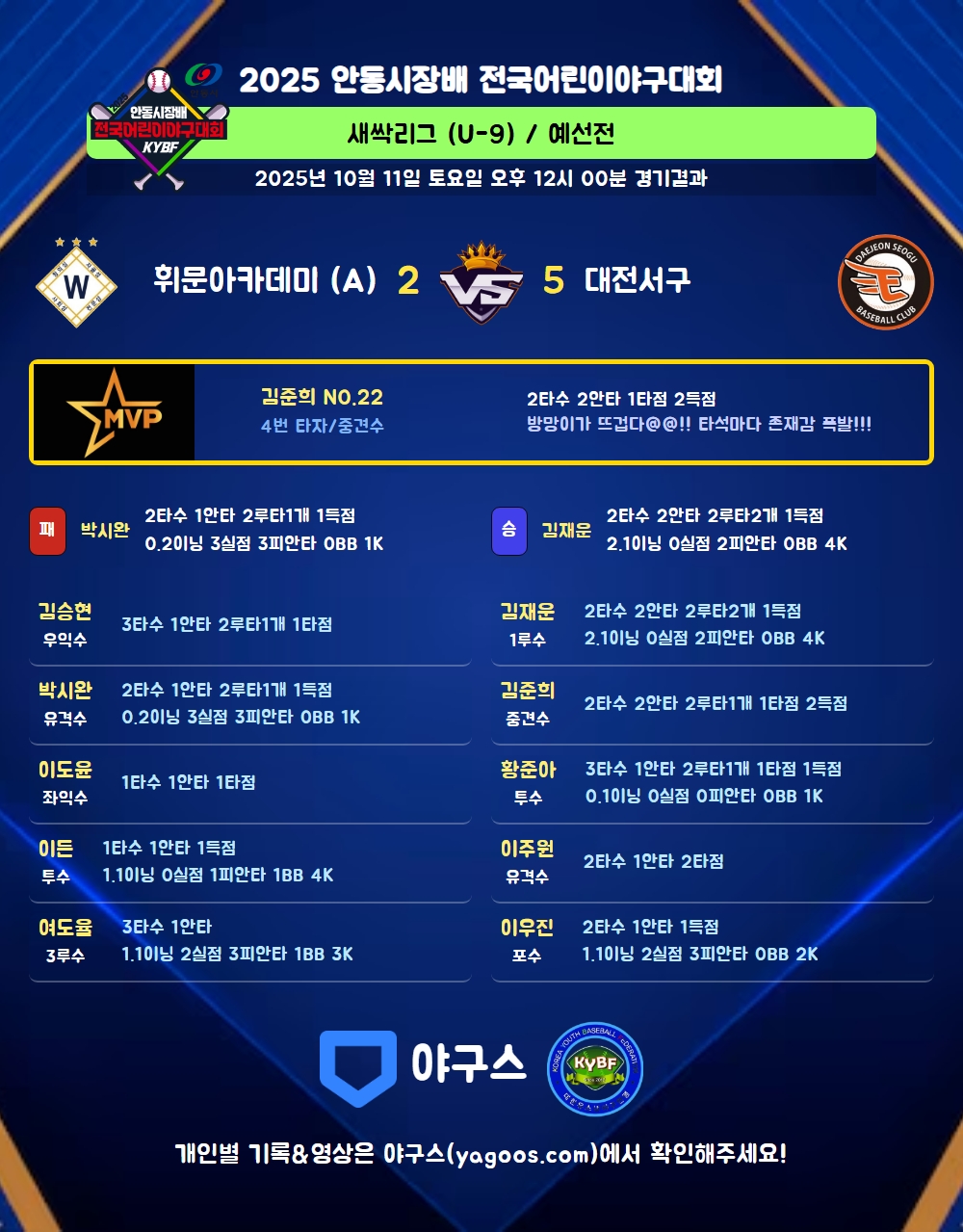 | 2루타 | 박시완(33) 김승현(75) 김재운(13) 황준아(17) 김준희(22) |