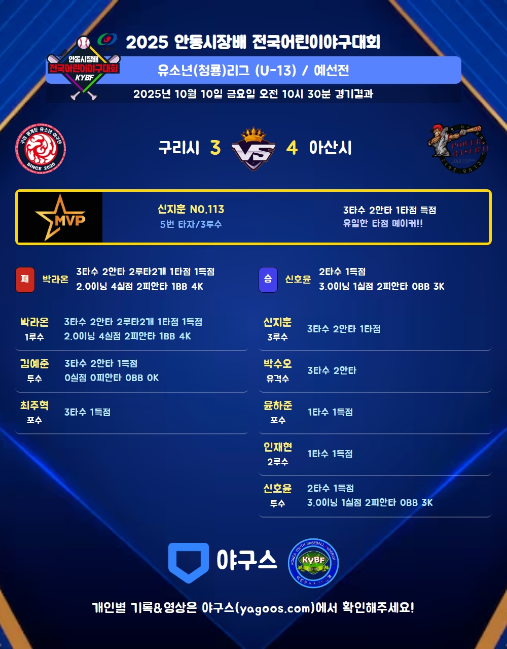 | 3 | 포 | 윤하준(1) | 유플 | - | - | 사구 | - | 4구 | 1 | 0 | - | 1 | - | - | 2 | - | 0.000 |