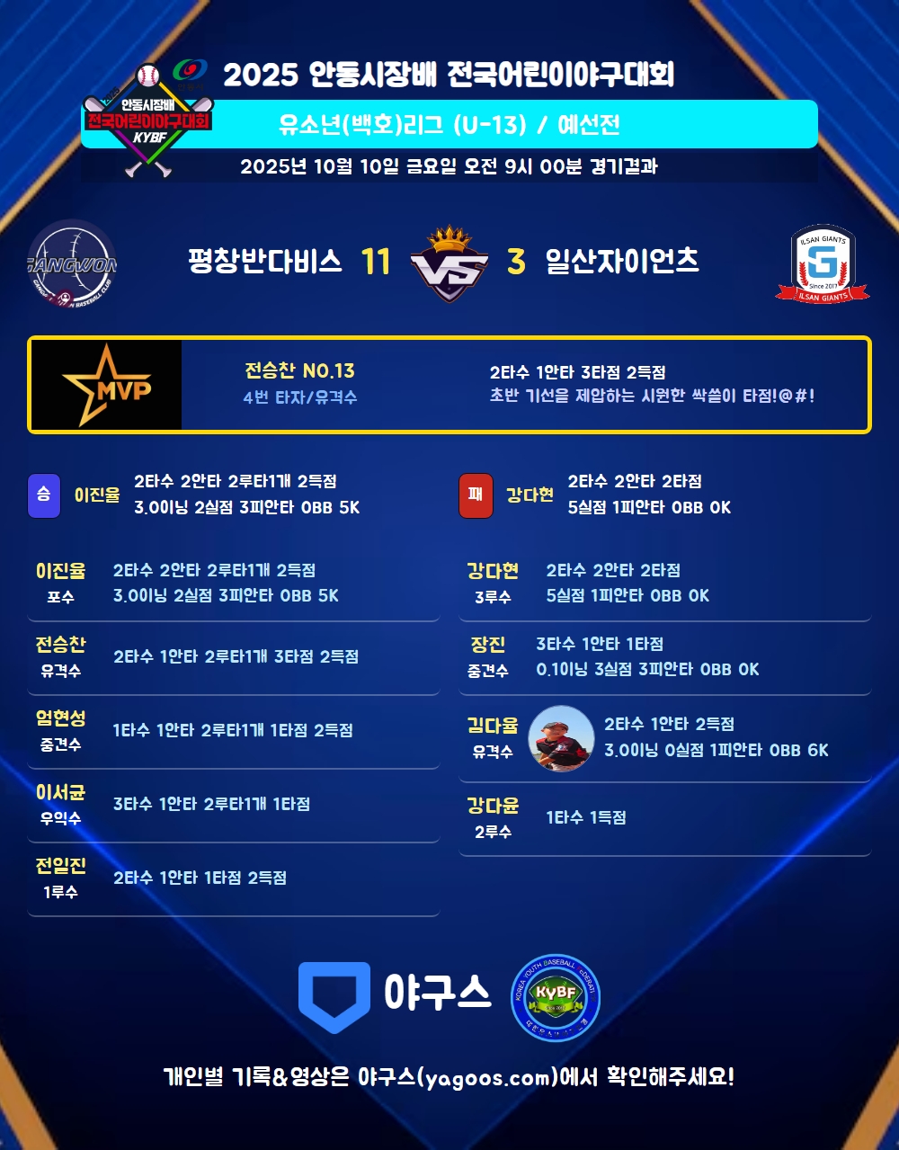 | 2루타 | 이진율(11) 엄현성(7) 전승찬(13) 이서균(10) |