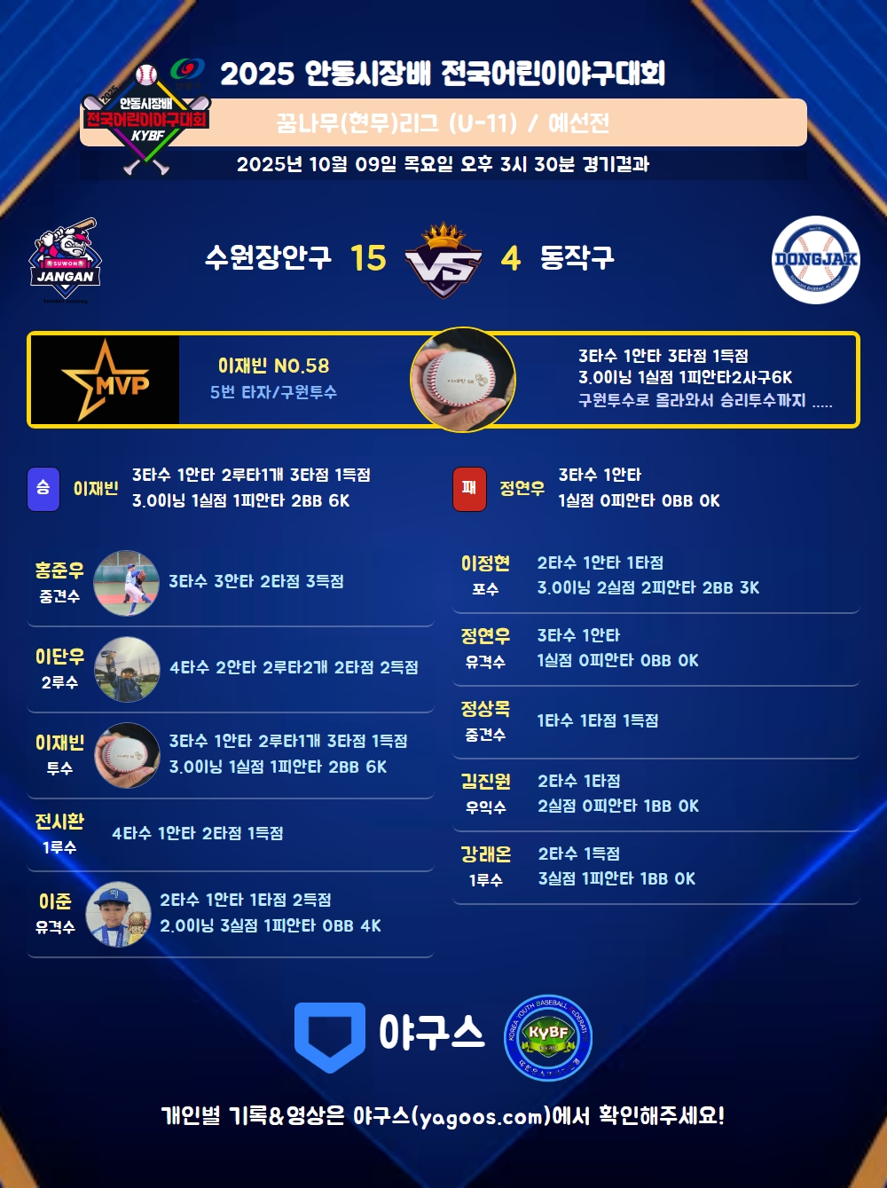 | 5 | 투 | 이재빈(58) | - | 1플 | - | 4구 | 투땅(1타점)/중전2(2타점) | - | 3 | 1 | 3 | 1 | - | 2 | 1 | - | 0.333 |