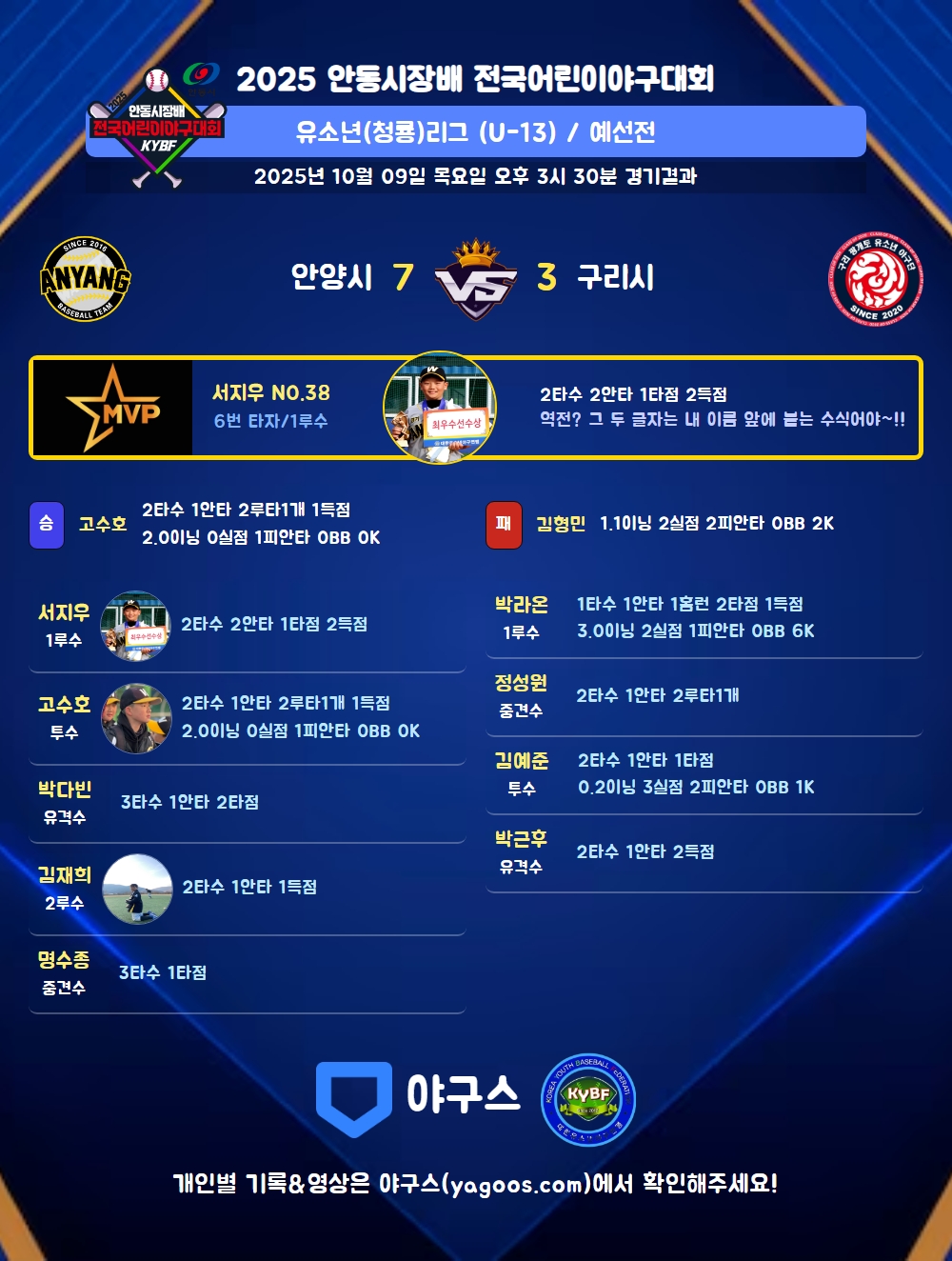 | 6 | 一 | 서지우(38) | - | 4구 | - | 우안 | 중안(1타점) | - | 2 | 2 | 1 | 2 | - | 1 | 1 | - | 1.000 |