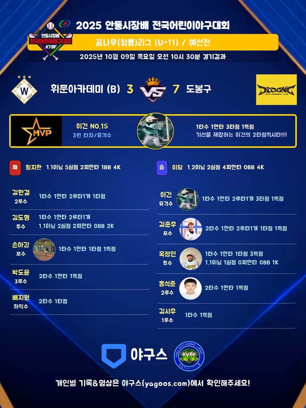 | 2루타 | 김도형(47) 김한결(19) 이건(15) 김준우(18) |