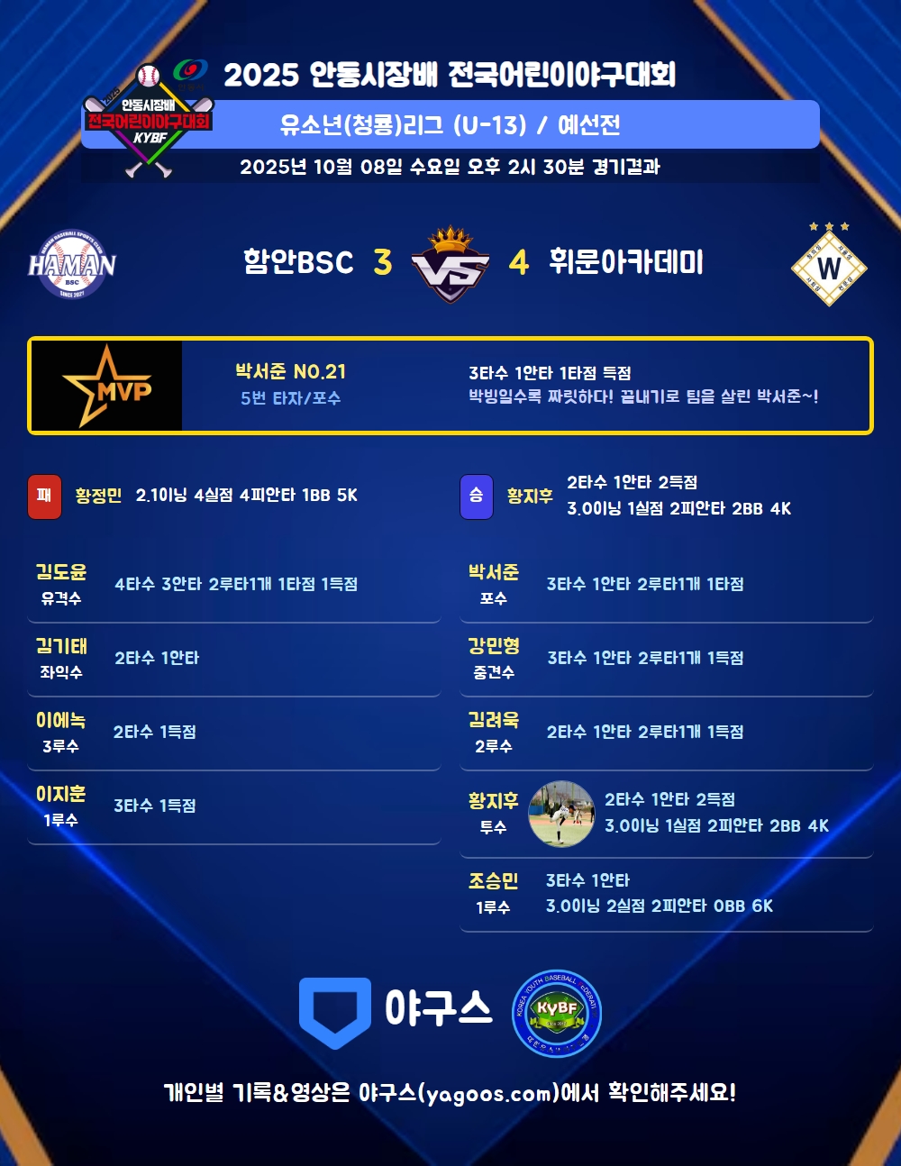 | 함안BSC | 1 | 1 | 0 | 1 | 0 | 0 | 3 | 4 | 2 | 7 | 7 |