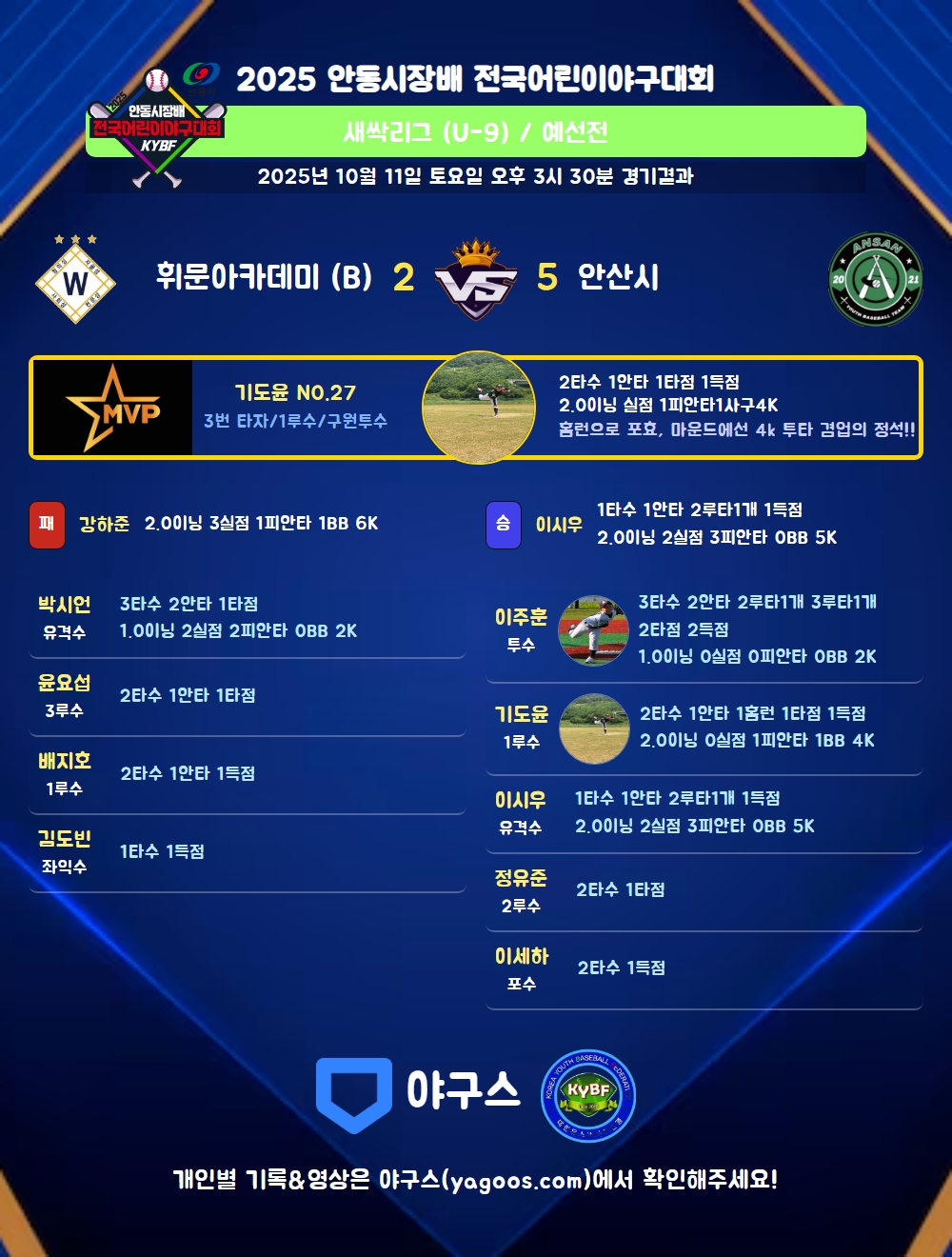 | 1 | 유 | 박시언(6) | 좌선안 | - | 유내안(1타점) | - | 투땅 | 3 | 2 | 1 | - | - | - | - | - | 0.667 |